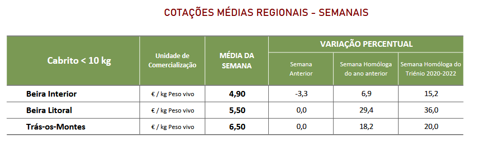 Na semana em análise ocorreu uma redução em relação à semana anterior da cotação média dos cabritos de <10 kg na região da Beira Interior (-17 cêntimos / kg); estabilidade na Beira Litoral e em Trás-os-Montes. Na Beira Interior registou-se uma descida das cotações dos cabritos de <10 kg na área de mercado da Sertã (-1,0 € / kg nas cot. mín. e máx. e -50 cêntimos / kg na cot. +freq.). Nesta área de mercado a oferta e a procura foram fracas.