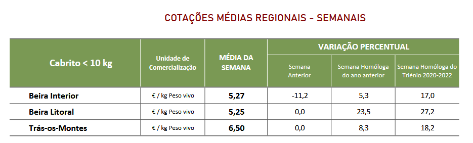 Na semana em análise registou–se uma redução em relação à semana anterior da cotação média dos cabritos de <10 kg na região da Beira Interior (–66 cêntimos / kg); estabilidade das cotações médias dos cabritos de <10 kg na Beira Litoral e em Trás–os–Montes. Descida de cotações dos cabritos, de <10 e de >10 kg, nas áreas de mercado do Alentejo Norte e de Estremoz (Alentejo), Cova da Beira, Guarda e Sertã (Beira Interior) e do Ribatejo (Ribatejo e Oeste).