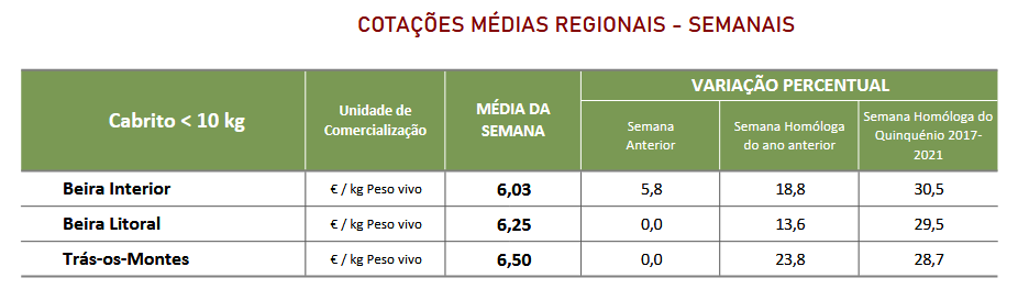 Na semana em análise registou-se um aumento da cotação média dos cabritos de <10 kg na região da Beira Litoral, em relação à semana anterior (+33 cêntimos / kg). Estabilidade das cotações médias destes animais na Beira Interior e em Trás-os-Montes. A semana passada os cabritos de <10 kg tinham subido na Beira Interior.