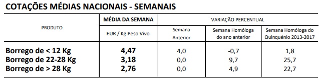 As cotações médias nacionais dos borregos de <12 Kg apresentaram um acréscimo em relação à semana anterior, +17 cêntimos / Kg. No que se refere aos borregos pesados, de 22-28 Kg e de >28 Kg, a tendência foi de estabilidade.