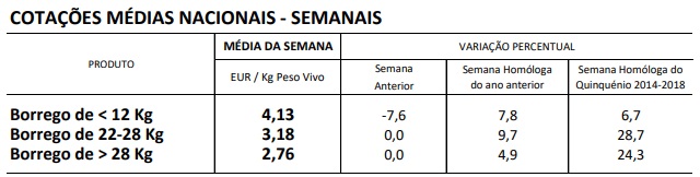 As cotações médias nacionais dos borregos de <12 Kg sofreram uma redução em relação à semana anterior, -34 cêntimos / Kg. No que se refere aos borregos pesados, de 22-28 Kg e de >28 Kg, a tendência continuou a ser de estabilidade.