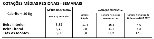 Na semana em análise a cotação média dos cabritos de <10 Kg sofreu uma redução na região da Beira Interior (-50 cêntimos / Kg); estabilidade destes animais na Beira Litoral e em Trás-os-Montes.