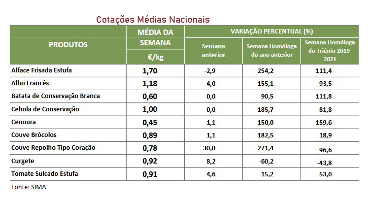 Na região Norte, na área de mercado Entre Douro e Minho, a menor oferta valorizou as cotações da beterraba em 50%, couve “Repolho Tipo Coração” 33% e alho francês 11%.
