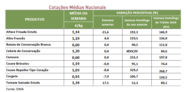 um aumento na cotação de 15%. A cotação da alface frisada desceu 15%, devido a uma menor procura. Uma maior oferta desvalorizou a cotação do
