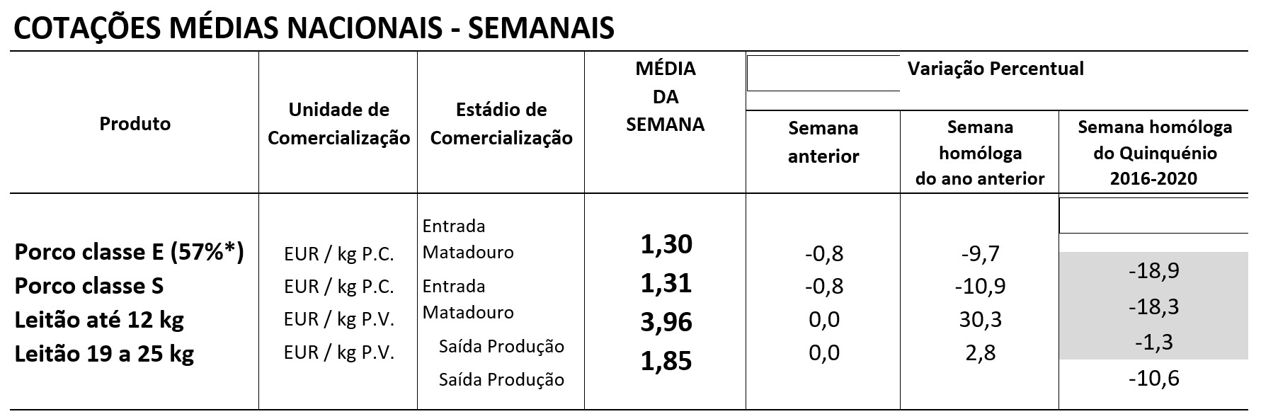 A situação do mercado europeu continua muito afetada pelo facto da China não estar a importar o que seria expectável, criando excesso de oferta. A oferta de leitão para assar foi relativamente fraca e a procura foi animada, tendo esta última sofrido um ligeiro decréscimo em relação à semana passada, com o cancelamento de algumas encomendas motivado pela subida dos casos de Covid-19. Estabilidade de cotações dos porcos classe E e classe S e descida da cotação máx. dos leitões de <12 kg (-16 cêntimos / kg).