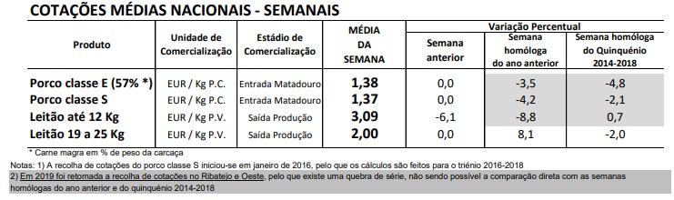 As cotações médias nacionais do porco classe E, do porco classe S e dos leitões de 19-25 Kg mantiveram-se estáveis em relação à semana anterior. Pelo contrário, os leitões <12 Kg voltaram a sofrer uma redução, pela 4ª semana consecutiva, -20 cêntimos / Kg.
