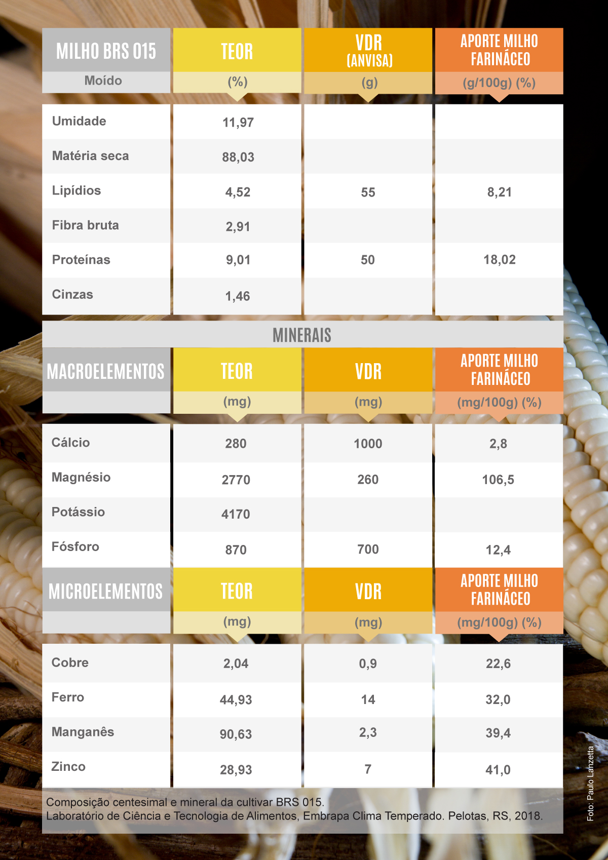 A sugestão é que, a partir dos grãos da BRS 015FB, seja produzida farinha integral, de maneira que ela incorpore os óleos naturais do milho – gorduras consideradas boas e responsáveis pelo bom funcionamento do organismo.