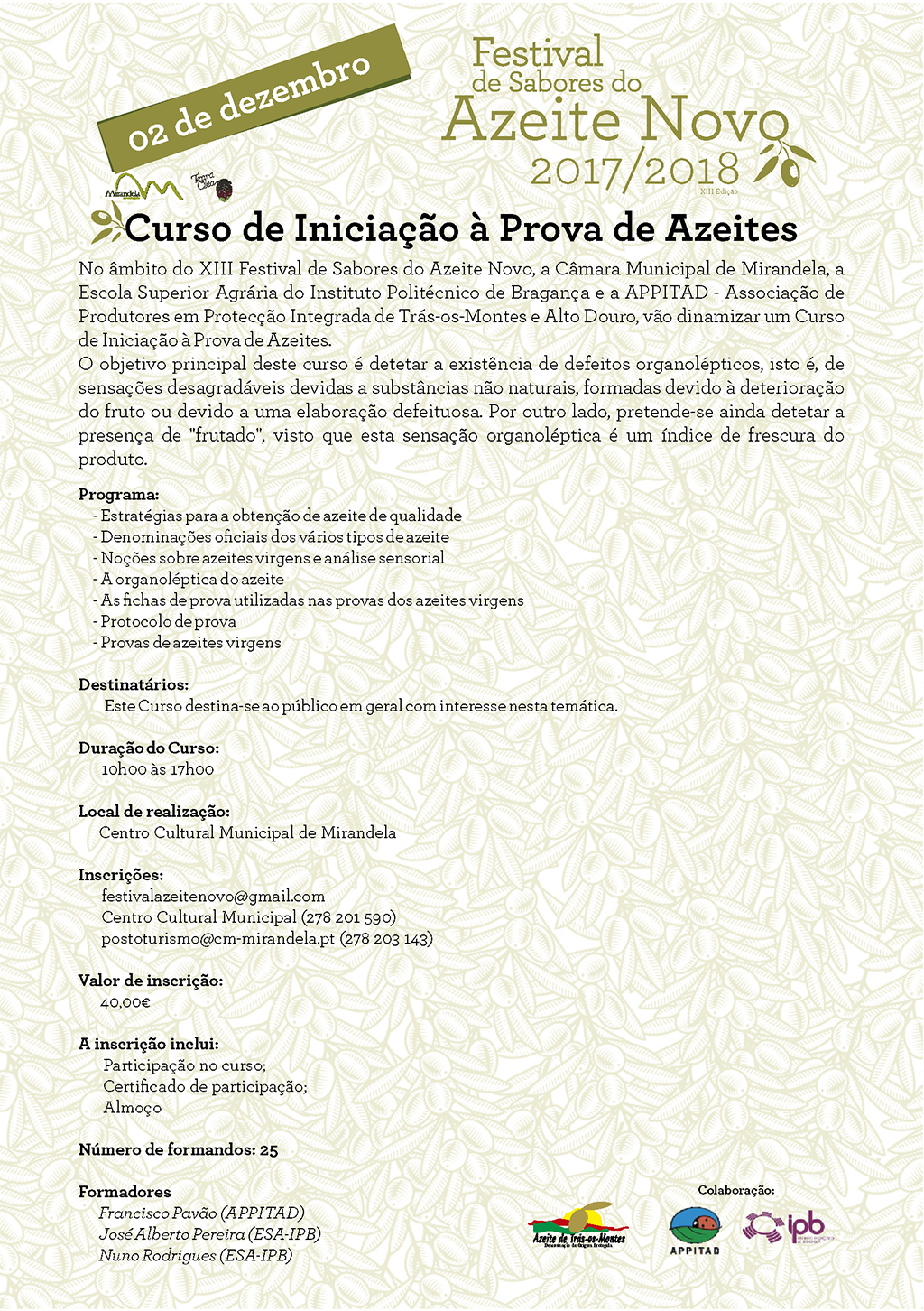 No âmbito do XIII Festival de Sabores do Azeite Novo, a APPITAD – Associação de Produtores em Protecção Integrada de Trás-os-Montes e Alto Douro e a Escola Superior Agrária de Bragança em colaboração com a Câmara Municipal de Mirandela, irão promover no dia 2 de Dezembro um Curso de iniciação à Prova de Azeites, conforme programa que junto anexamos.