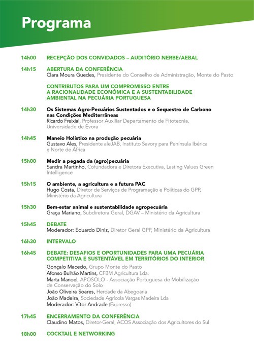 A abertura do evento estará a cargo de Clara Moura Guedes, CEO do Monte do Pasto e o encerramento caberá a Claudino Matos, Diretor-Geral da Associação dos Agricultores do Sul (ACOS).