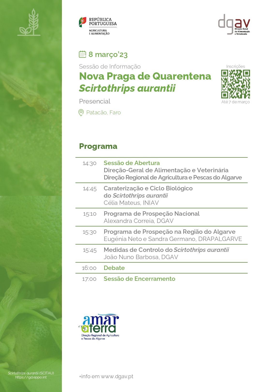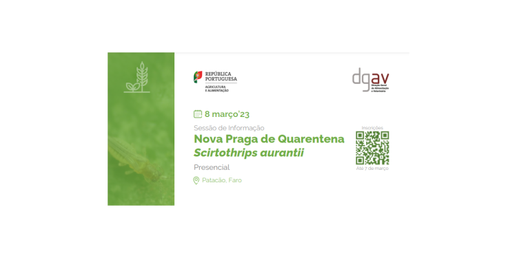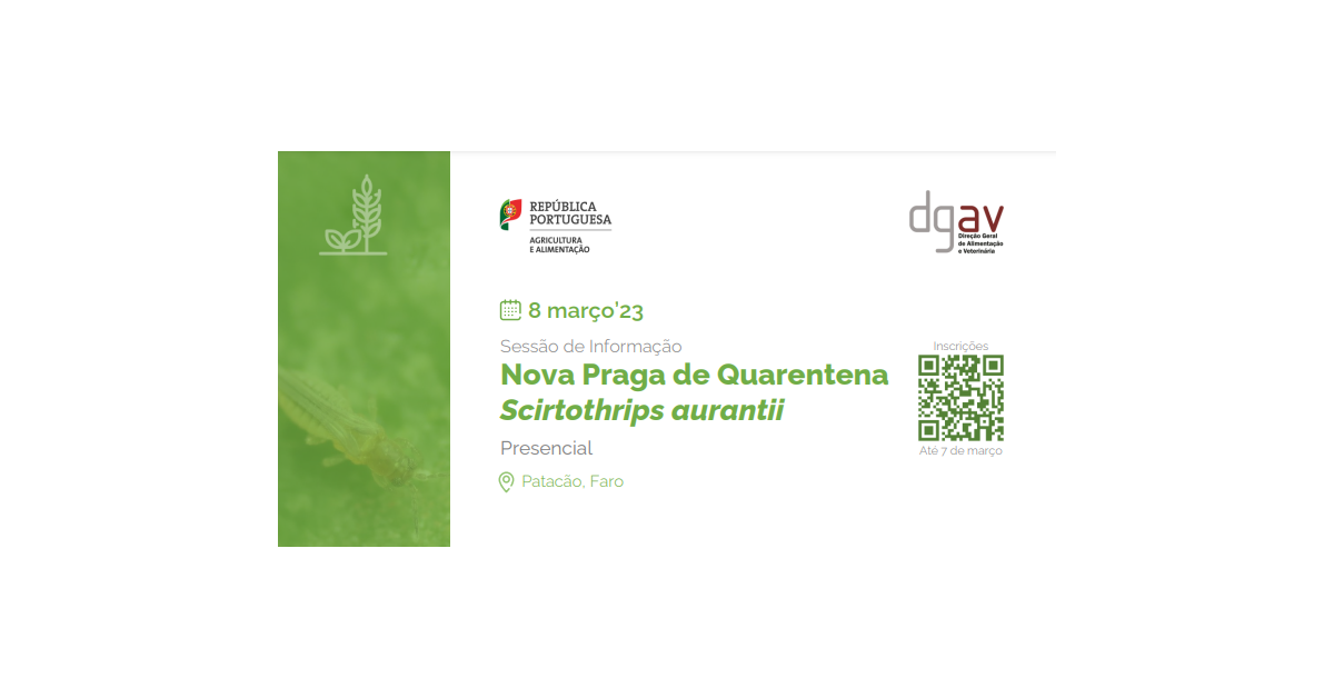 No próximo dia 8 de março, a DGAV vai realizar em parceria com a DRAPALGARVE uma Sessão de Informação sobre a «Nova Praga de Quarentena Scirtothrips aurantii» no Patacão, Faro, entre as 14h30 e as 17h00, sessão presencial.