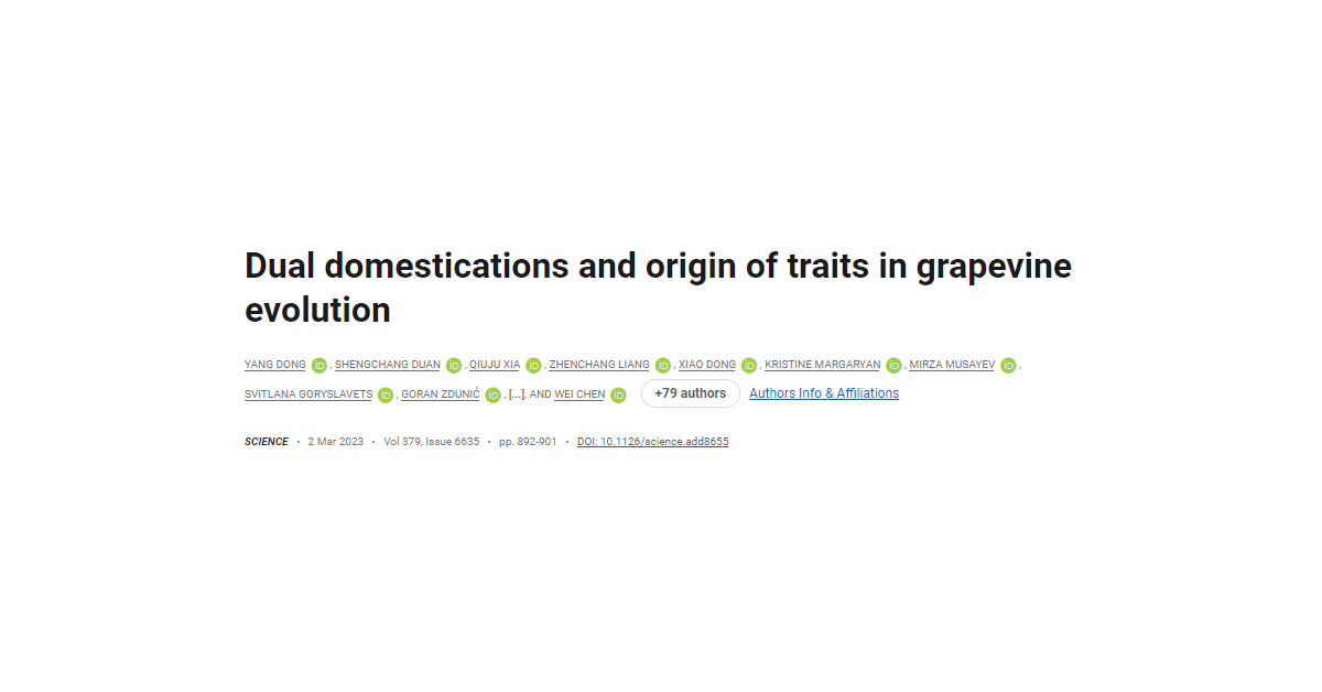 We elucidate grapevine evolution and domestication histories with 3525 cultivated and wild accessions worldwide. In the Pleistocene, harsh climate drove the separation of wild grape ecotypes caused by continuous habitat fragmentation. Then, domestication occurred concurrently about 11,000 years ago in Western Asia and the Caucasus to yield table and wine grapevines. The Western Asia domesticates dispersed into Europe with early farmers, introgressed with ancient wild western ecotypes, and subsequently diversified along human migration trails into muscat and unique western wine grape ancestries by the late Neolithic. Analyses of domestication traits also reveal new insights into selection for berry palatability, hermaphroditism, muscat flavor, and berry skin color. These data demonstrate the role of the grapevines in the early inception of agriculture across Eurasia.
