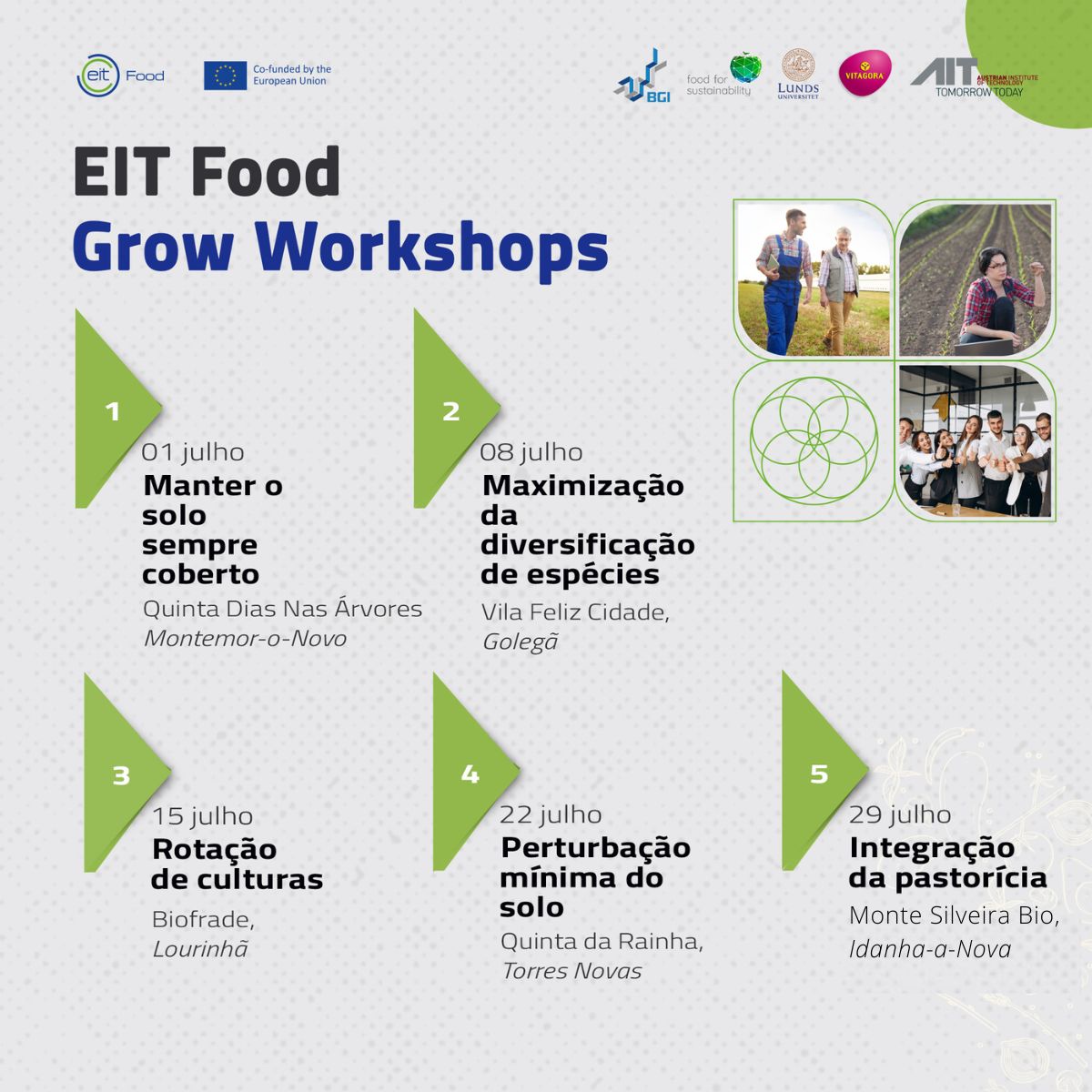 As EIT Food Grow Workshops estão de regresso a Portugal. Todas as sextas-feiras durante o mês de Julho, das 9h00 às 12h30, serão debatidas tendências e tecnologias emergentes na área da agricultura sustentável e regenerativa. Agricultores, produtores, Pequenas e Médias Empresas (PMEs), e todos os interessados nesta temática podem agora inscrever-se gratuitamente para estas sessões de formação através do website da iniciativa.