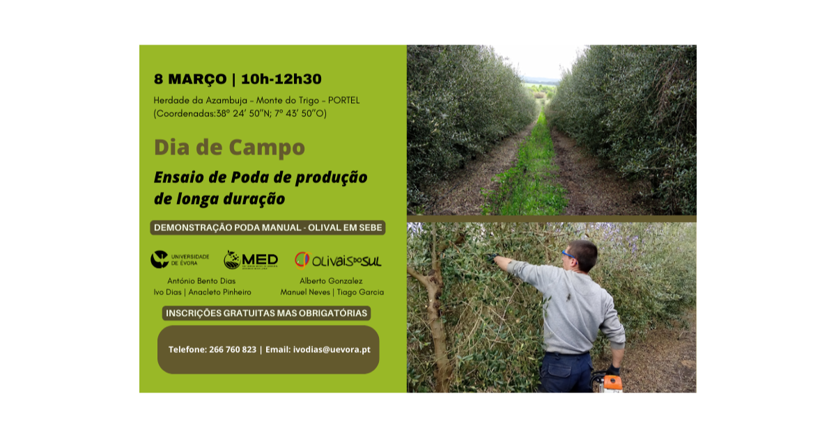 No dia 8 de março, as duas entidades convidam a participação de todos os interessados numa Demonstração de Poda Manual de Olival em sebe. Neste dia de campo pretende-se mostrar o ensaio, procedendo à demonstração de poda com motosserra em árvores submetidas à mesma solução de poda desde 2015.