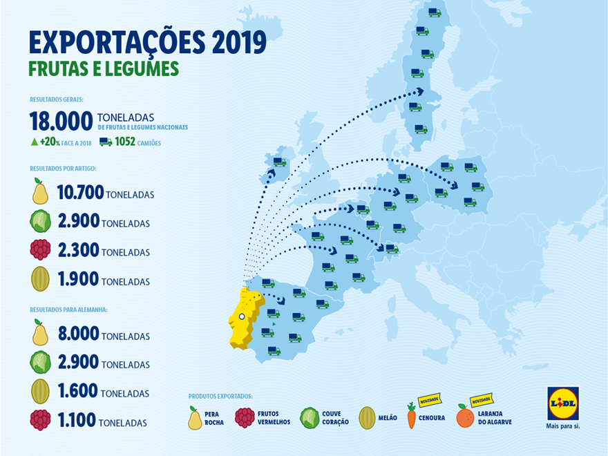 Os recentes resultados desta exportação conjunta representam um crescimento de mais de 20% face ao período anterior e reafirmam o contributo do Lidl Portugal no apoio aos produtores portugueses na exportação de frutas e legumes para o mercado europeu. Entre março de 2019 e janeiro de 2020, mais de 1000 camiões saíram do nosso país, carregados destes produtos nacionais, rumo a 8 países europeus.