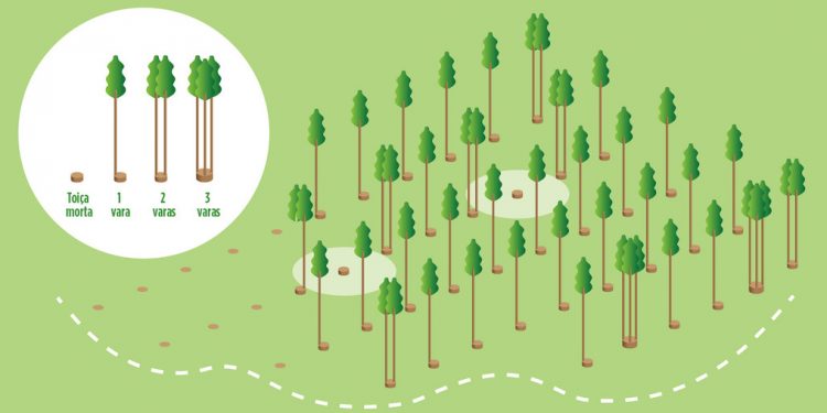 – Quando não há falhas de plantação e de rebentação de toiças (cepos), deixar uma a duas varas em toiças com mais de 20 cm para obter até 1 800 varas/ha.