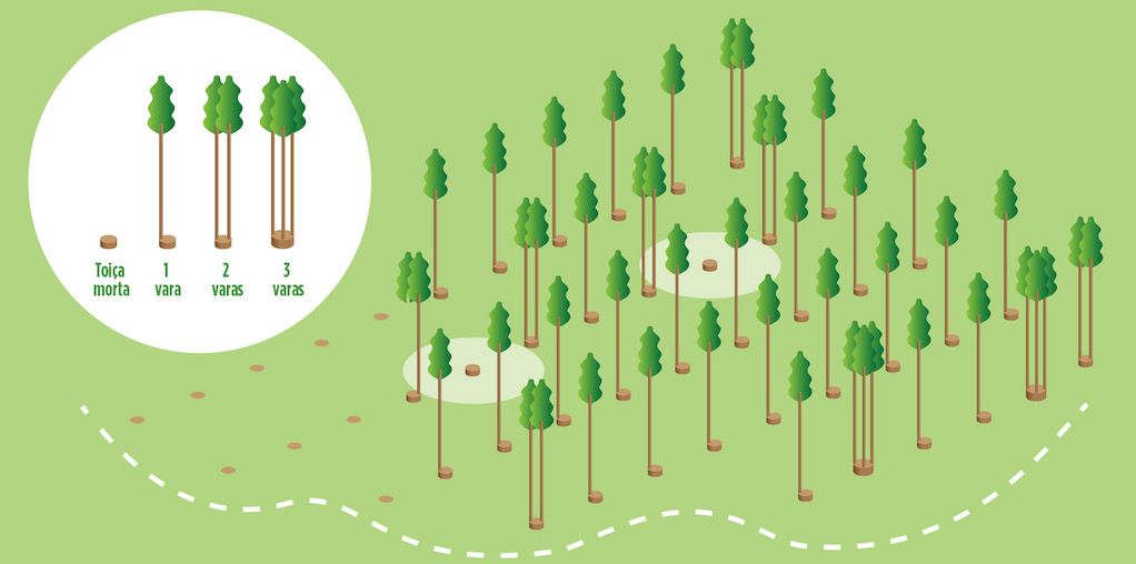 Escolher os rebentos mais vigorosos nas toiças leva ao aumento do volume de madeira produzido, facilita o corte e diminui o risco de incêndio.