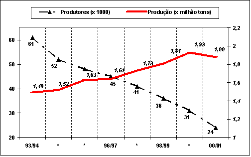 O crescimento da produção foi acompanhado pela diminuição muito expressiva do numero de Produtores.