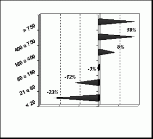 Nas restantes, com destaque para as que produzem acima de 400 toneladas, o seu numero aumentou ligeiramente e o seu volume registou elevadas taxas de expansão, como é visível no Quadro e no Gráfico abaixo.