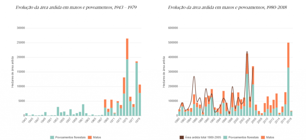 Dados de Pordata – Incêndios rurais e área ardida – Continente (29/05/2019); Fire frequency analysis in Portugal (1975–2005),using Landsat-based burnt area maps