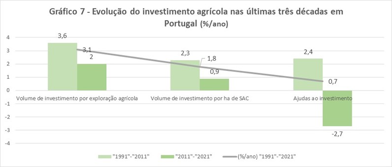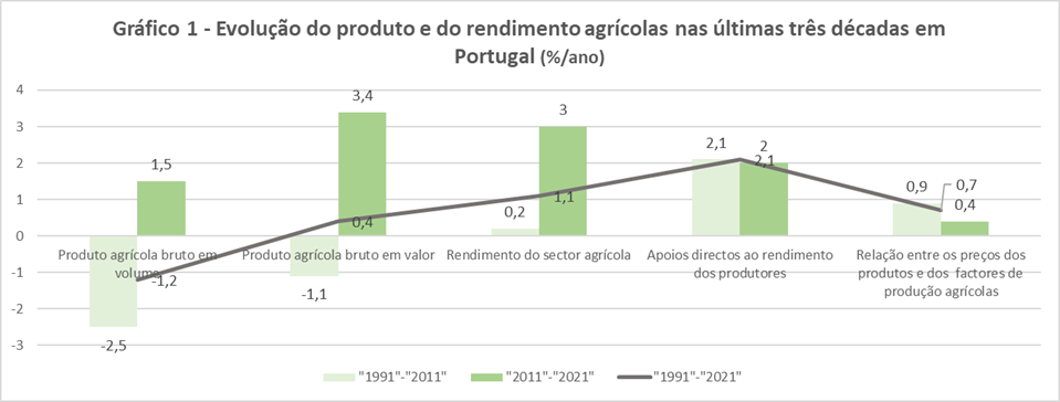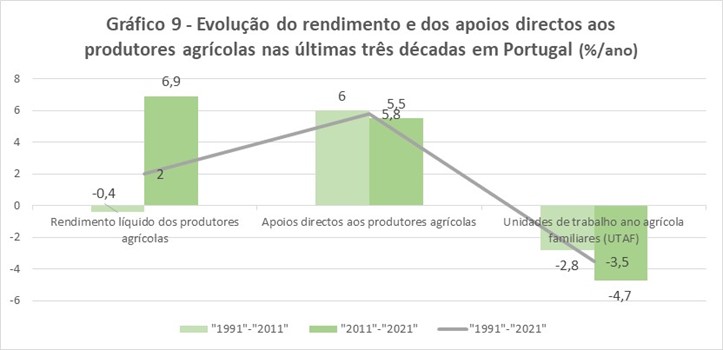 • um crescimento de 2,0%/ano do seu valor a preços reais entre “1991” e “2021”, que é explicado, maioritariamente, por um crescimento de -3,5%/ano do respectivo volume de mão-de-obra agrícola familiar;