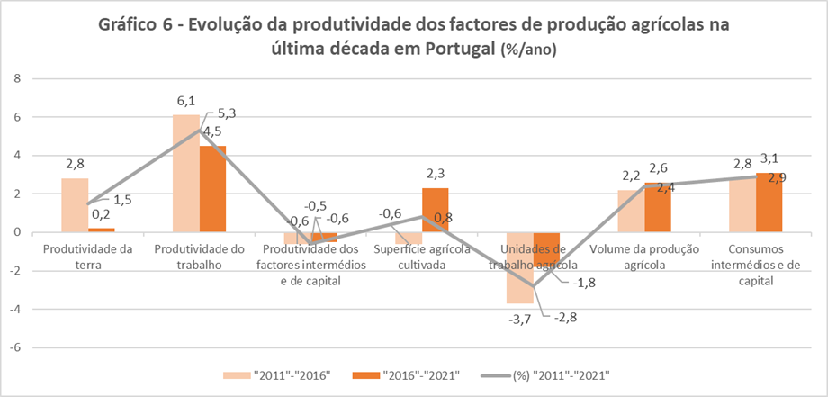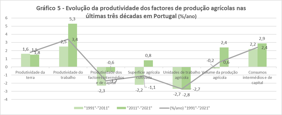 Neste contexto, é de realçar, em nossa opinião, que a melhoria muito significativa verificada na evolução da produtividade dos factores intermédios e de capital durante esta última década, reflete os ganhos de eficiência técnica entretanto alcançados pelos produtores agrícolas nacionais.