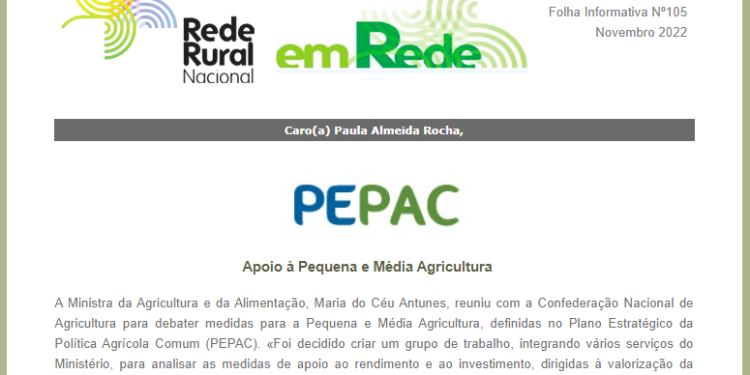 A Rede Rural Nacional publicou a mais recente Folha Informativa “EmRede”com o Nº105, do mês de novembro, que tem em destaque o reforço do Governo na estratégia de apoio à Pequena e Média Agricultura.
