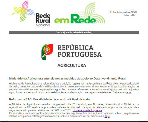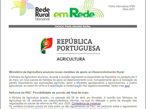 A Rede Rural Nacional publicou a mais recente Folha Informativa “EmRede”com o Nº96, do mês de maio, na qual faz destaque às novas medidas de apoio ao Desenvolvimento Rural, anunciadas pela Ministra da Agricultura, durante a audição regimental na Assembleia da República no passado dia 4 de maio.