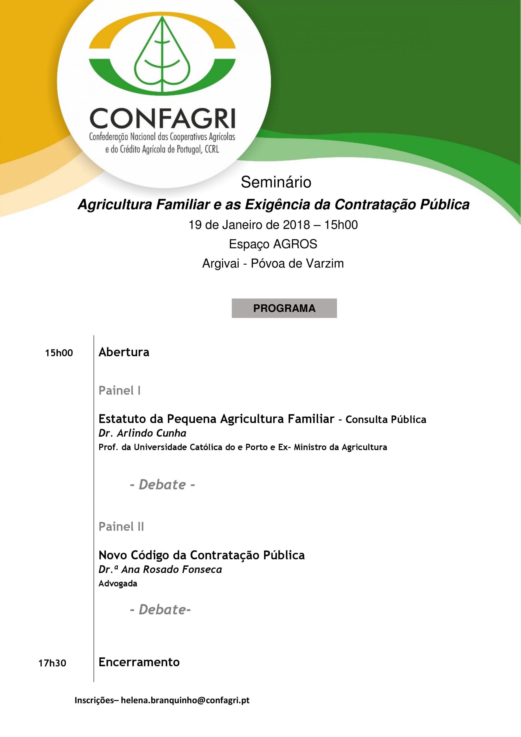 O encontro terá lugar pelas 15h00 no Espaço AGROS, em Argivai (Póvoa do Varzim) e vai ser conduzido por Arlindo Cunha, Prof. da Universidade Católica do Porto e Ex-Ministro da Agricultura e pela Advogada Ana Rosado, que vai abordar a questão do Novo Código da Contratação Pública e as exigências que dele decorrem para as organizações agrícolas.