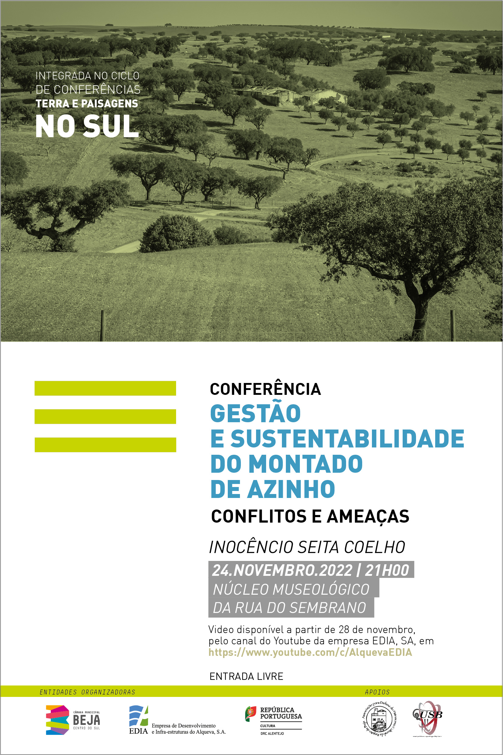 Integrada no ciclo de conferências “Terra e paisagens do Sul”, vai ter lugar no próximo dia 24 de novembro no Museu do Sembrano, em Beja, a conferência “Gestão e Sustentabilidade do Montado de Azinho, Conflitos e Ameaças”, onde será orador o Engenheiro Agrónomo Inocêncio Seita Coelho.