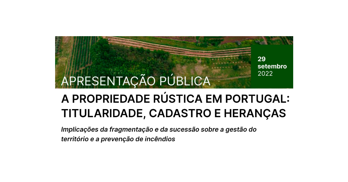 A sessão, intitulada “A Propriedade Rústica em Portugal: titularidade, cadastro e heranças – implicações da fragmentação e da sucessão sobre a gestão do território e a prevenção de incêndios” conta com a presença do Secretário de Estado da Conservação da Natureza e Florestas, João Paulo Catarino, para a abertura, e inclui também intervenções de Dulce Lopes, professora da Faculdade de Direito da Universidade de Coimbra e de Joaquim Sande Silva, professor da ESAC.