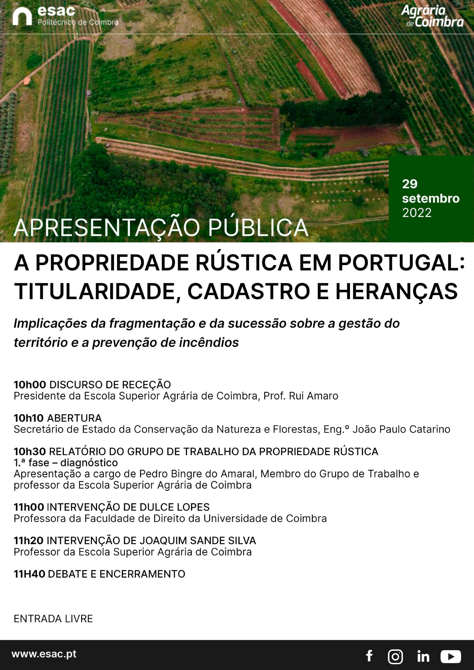 Realiza-se na Escola Superior Agrária do Politécnico de Coimbra (ESAC – IPC), no próximo dia 29 de setembro, no seu auditório principal, com início às 10h00, a apresentação pública do relatório do «Grupo de Trabalho da Propriedade Rústica».