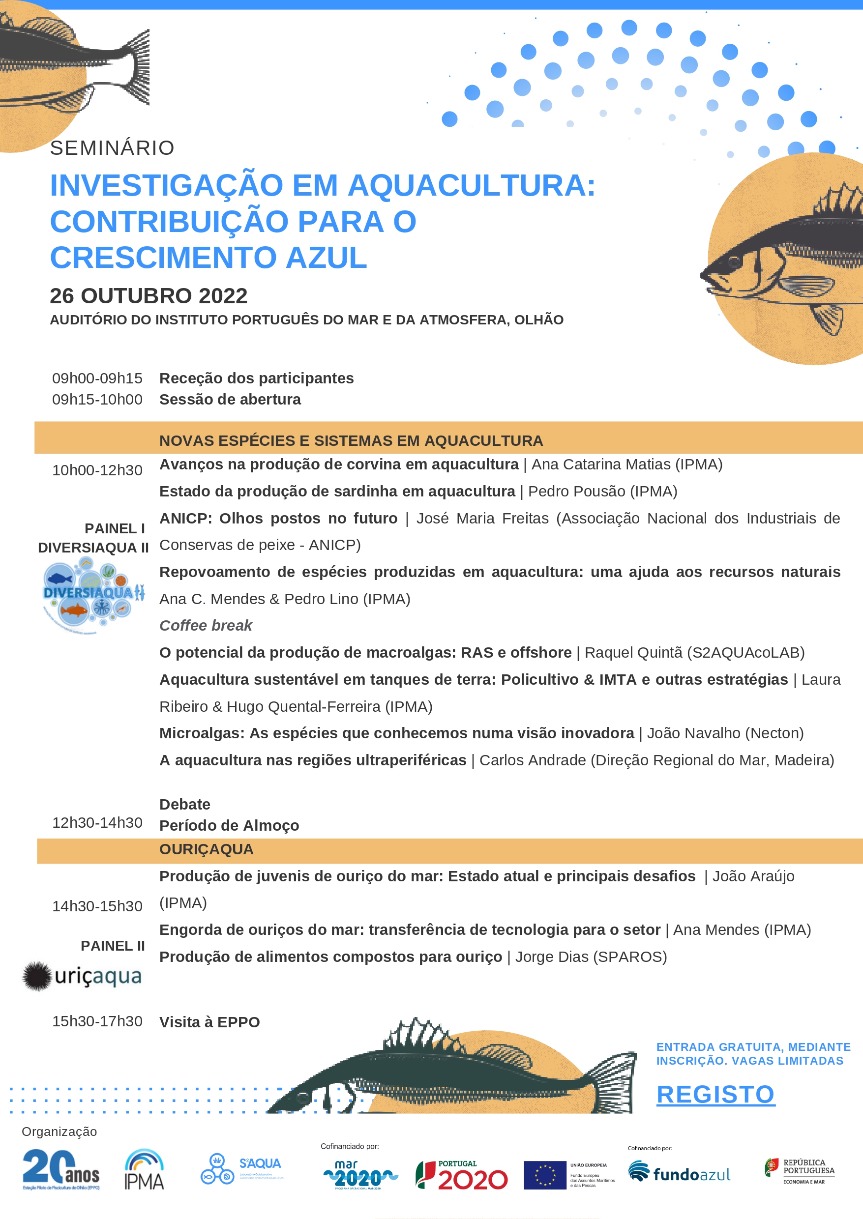 O IPMA divulga o seminário “Investigação em Aquacultura: Contribuição para o Crescimento Azul”, a decorrer nos dias 26 e 27 de outubro de 2022, na Estação Experimental de Piscicultura de Olhão (EPPO).