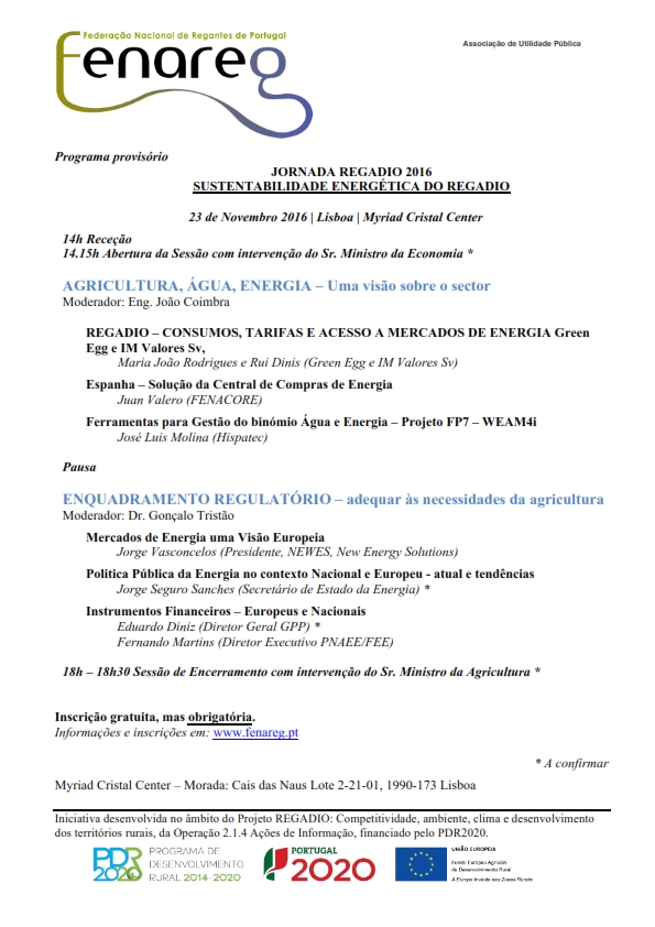 A FENAREG organiza a Jornada Regadio 2016 sobre o tema da Sustentabilidade Energética do Regadio, que terá lugar no próximo dia 23 de Novembro, em Lisboa, no Myriad Cristal Center. O evento será centrado no enquadramento do regadio ao nível dos consumos e dos preços de eletricidade, na visão dos mercados de energia e nas políticas públicas, quer nacionais, quer europeias e dar orientações sobre os instrumentos financeiros que estão disponíveis para dar resposta às necessidades dos sectores, neste caso, do regadio.
