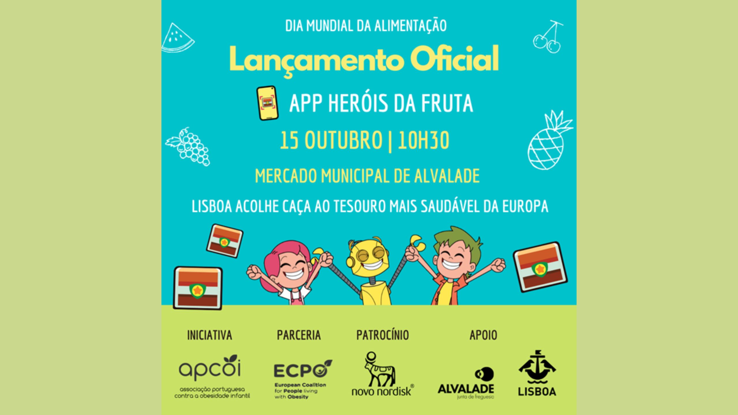A Associação Portuguesa Contra a Obesidade Infantil (APCOI) promove o lançamento da app Heróis da Fruta no município de Lisboa, no próximo dia 15 de Outubro (sábado), véspera do Dia Mundial da Alimentação, às 10h30 no Mercado Municipal de Alvalade.