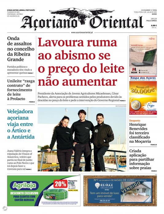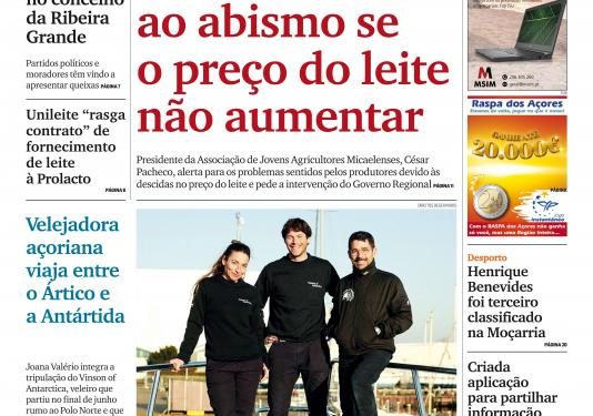 “Velejadora açoriana viaja entre o Ártico e a Antártida”, “Onda de assaltos no concelho da Ribeira Grande”, “Unileite “rasga contrato” de fornecimento de leite à Prolato” e “Criada aplicação para partilhar informação sobre praias” são outros destaques desta Primeira Página.