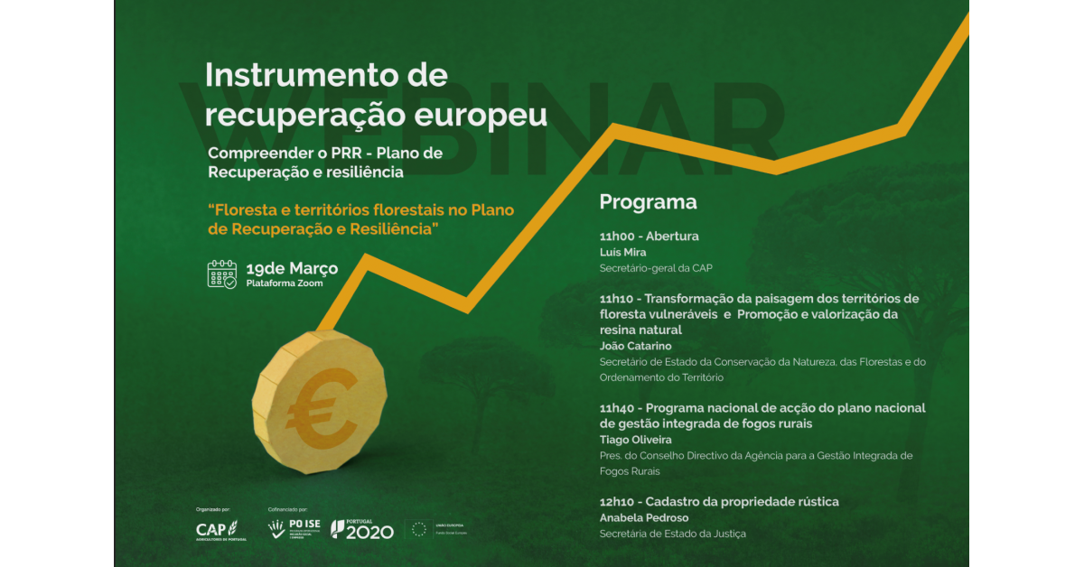 Prosseguindo a abordagem ao tema “Instrumento de Recuperação Europeu, Compreender o PRR – Plano de Recuperação e Resiliência”, a CAP promove um segundo webinário dedicado especificamente ao tratamento das medidas nele preconizadas para a floresta e os territórios florestais, analisando-se as respectivas reformas e investimentos.