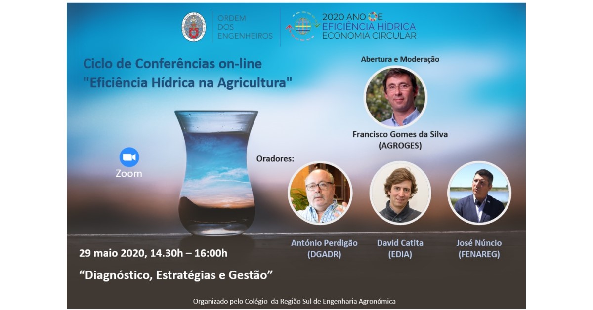 A primeira sessão do Ciclo de Conferências online sobre “Eficiência Hídrica na Agricultura” decorreu no passado dia 29 de maio, que teve como foco as etapas de Diagnóstico, Estratégias e Gestão e foi organizada pelo Conselho Regional Sul do Colégio de Engenharia Agronómica, através da plataforma zoom.