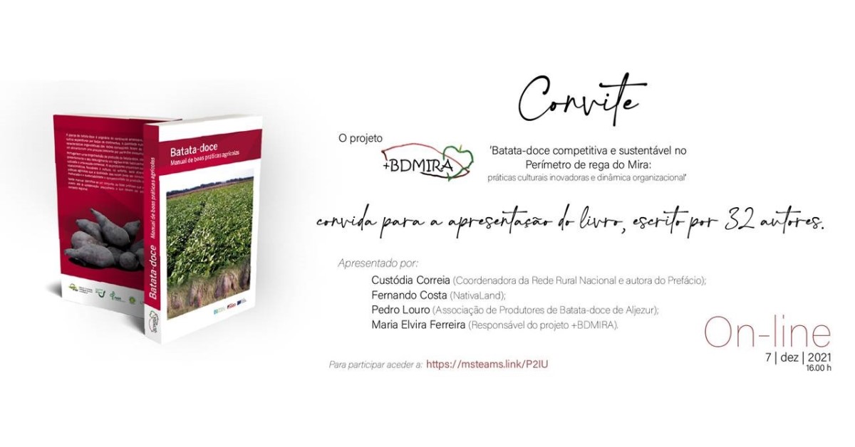 O livro “Batata-doce. Manual de boas práticas agrícolas” vai ser apresentado no dia 7 de dezembro de 2021 (3.ª feira), pelas 16h00 em formato online. A obra é publicada no âmbito do Grupo Operacional +BDMira “Batata-doce competitiva e sustentável no Perímetro de Rega do Mira: técnicas culturais inovadoras e dinâmica organizacional”.