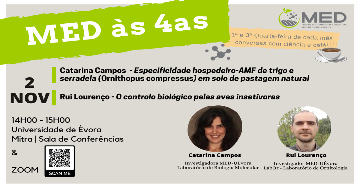 A próxima sessão do MED às 4as é já dia 2 de novembro, entre as 14h e 15h, e terá como oradores convidados Catarina Campos, investigadora do MED no Laboratório de Biologia Molecular da Universidade de Évora, e Rui Lourenço, investigador do MED no LabOr – Laboratório de Ornitologia da Universidade de Évora.