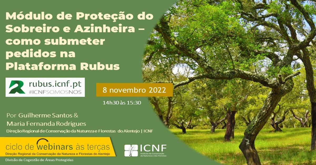 Breve explicação sobre como aceder à plataforma RUBUS – Módulo de Proteção do Sobreiro e Azinheira. Abordagem das seguintes temáticas: registo de utilizadores; comunicação de cortes de sobreiro e azinheira; pedido de autorização de corte/arranque de sobreiros e azinheiras; pedido de autorização de podas e legislação de proteção do sobreiro e da azinheira – conceitos e enquadramento dos pedidos.