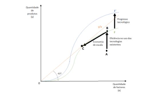 Como se pode concluir da leitura do Gráfico 1, todos os três caminhos conduzem a ganhos de produtividade (melhoria no rácio produto-factores) mas enquanto que a adopção de novas tecnologias e a maior eficiência no uso da tecnologias disponíveis contribui para o aumento da produção (y) para igual (ou menor) quantidade de factores (x), as economias de escala, por si só, poderão conduzir a decréscimos de produção que, apesar de associadas a reduções no uso dos inputs, não geram necessariamente ganhos de valor acrescentado.