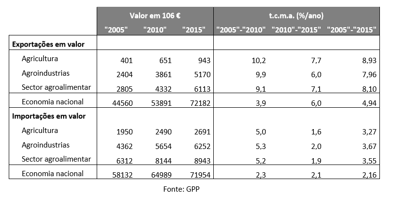 O valor das exportações de bens agroalimentares cresceu a um elevado ritmo de 8,1%/ano, entre os triénios “2005” e “2015”, ou seja, a um ritmo muito superior ao do conjunto da economia nacional (4,4%/ano) (Quadro 1).