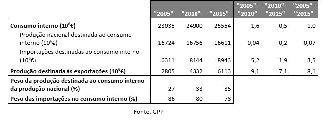 - o peso das exportações na produção nacional aumentou 12 pp, tendo passado de 20% em “2005”, para 26% em “2010” e para 32% em “2015”;