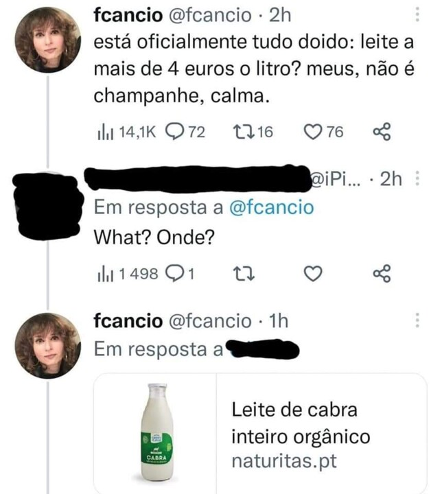 A jornalista Fernanda Câncio decretou (twetou) que “está oficialmente tudo doido” porque encontrou leite à venda a 4,99€ e o assunto “viralizou”. Acontece que não se tratava de leite de vaca, o que subentendemos quando escrevemos apenas “leite”, mas neste caso era “leite de cabra biológico” importado.