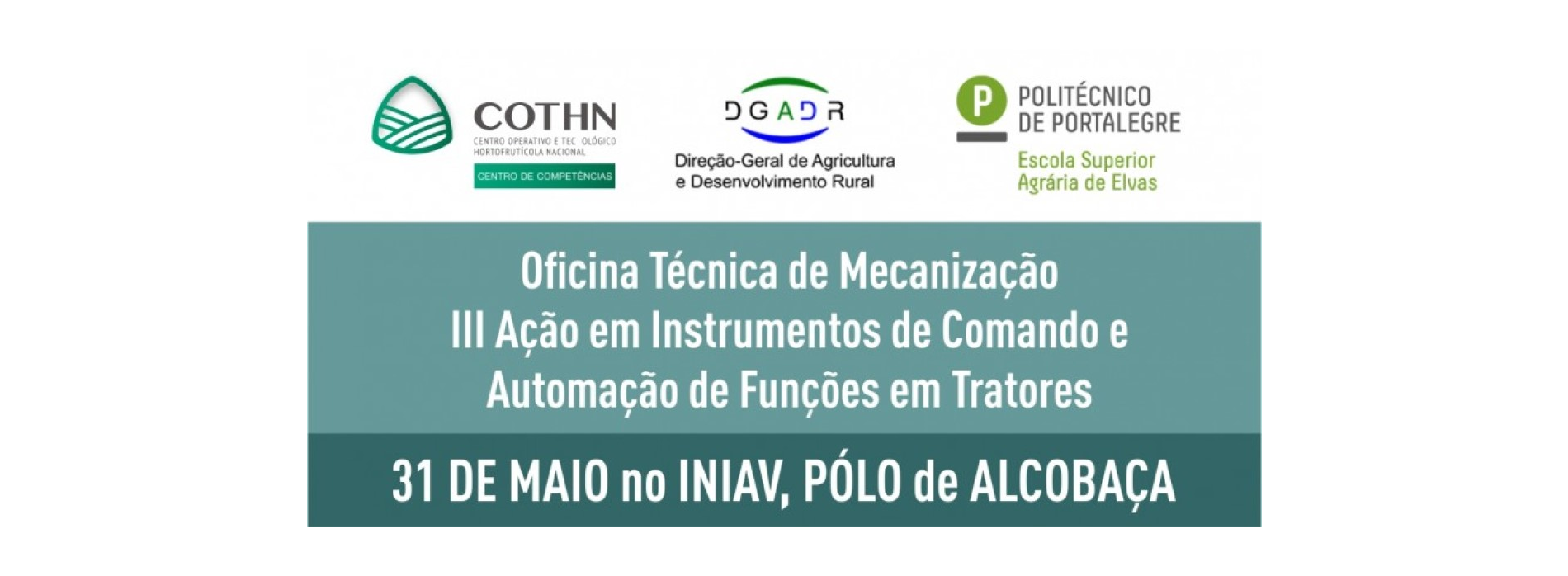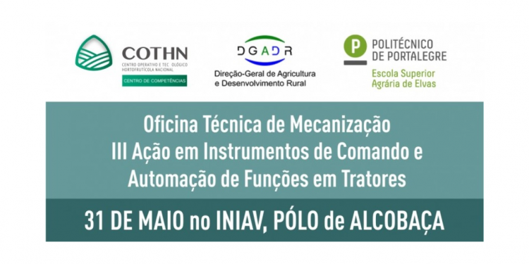 [Fonte: COTHN] O COTHN-CC, em colaboração com a Direcção Geral de Agricultura e Desenvolvimento Rural (DGADR) e a Escola Superior Agrária de Elvas – IP Portalegre, vai acolher no próximo dia 31 de maio durante todo o dia, na Estação Nacional de Fruticultura Vieira Natividade (INIAV, IP), em Alcobaça, uma “Oficina Técnica de Mecanização – III Ação em Instrumentos de Comando e Automação de Funções em Tratores”.