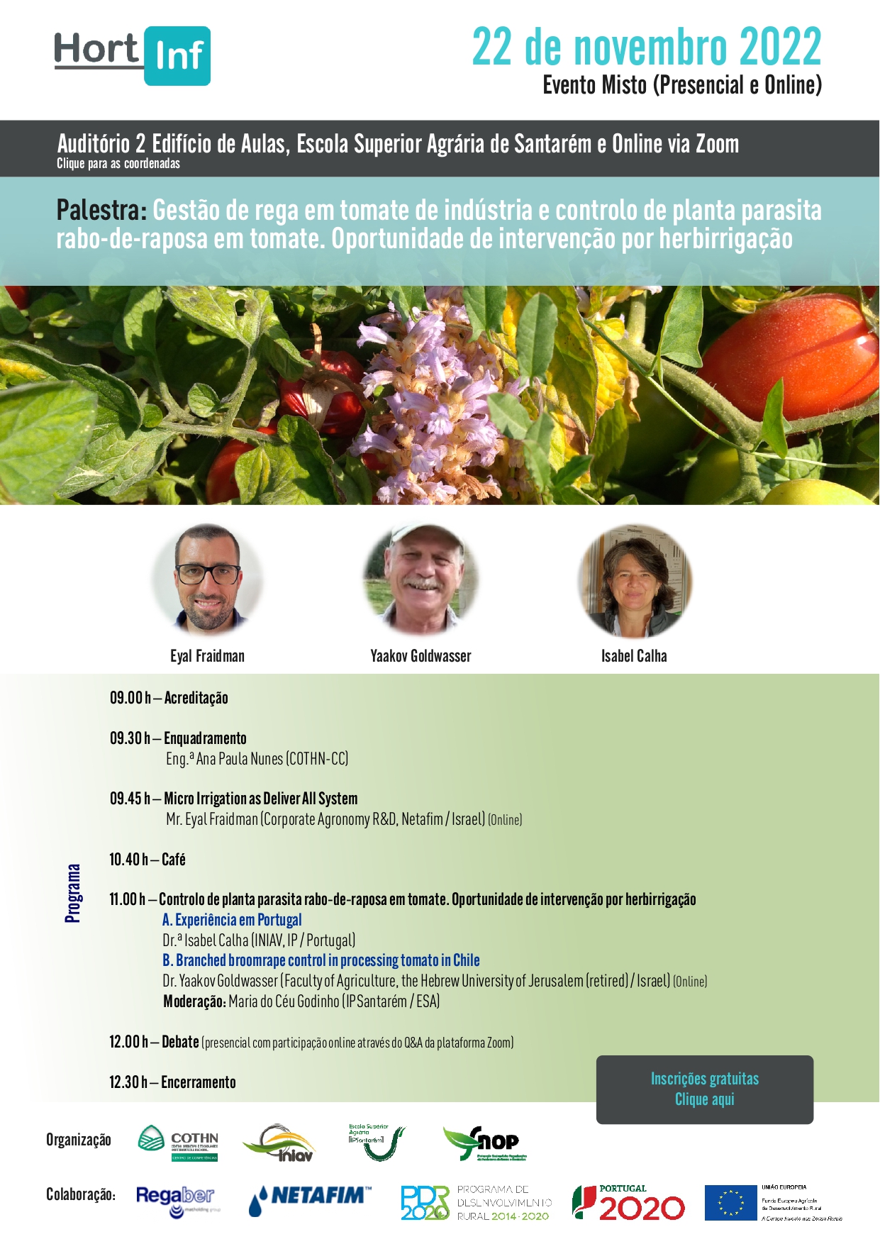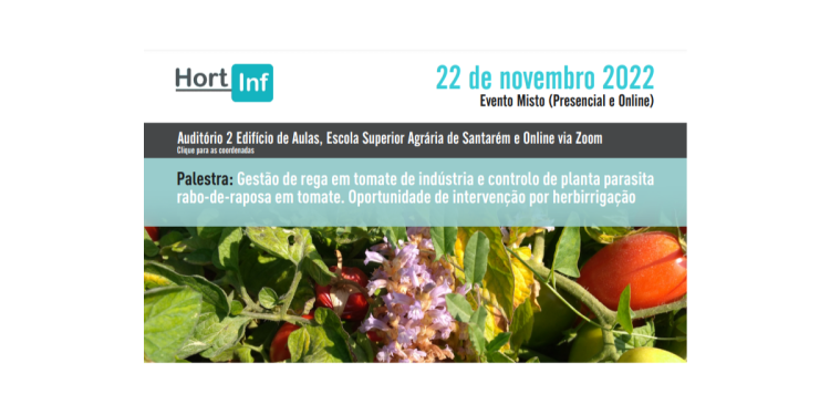 A Palestra “Gestão de rega em tomate de indústria e controlo de planta parasita rabo-de-raposa em tomate. Oportunidade de intervenção por herbirrigação” realiza-se no dia 22 de novembro em formato misto, no Auditório 2 da Escola Superior Agrária de Santarém.