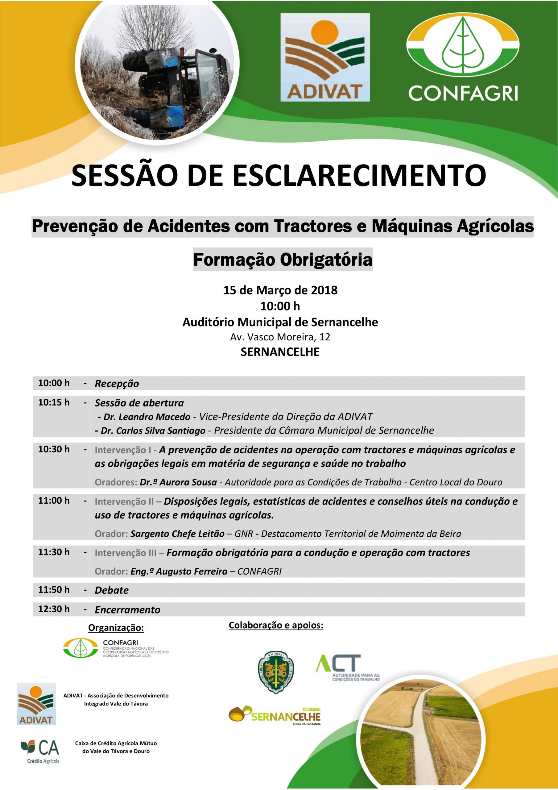 Esta iniciativa, que terá lugar no Auditório Municipal de Sernancelhe tem por objetivo alertar para os riscos inerentes à condução de tratores e máquinas agrícolas e aconselhar quanto à forma de prevenir os acidentes de trabalho que resultam dessa atividade, ainda a principal causa de morte no setor.