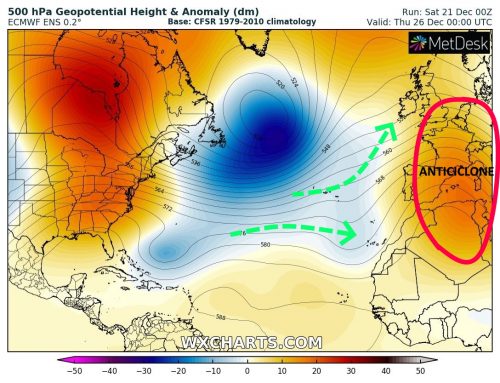 A previsão semanal para 22-28 Dezembro aponta para o predomínio da influencia de um anticiclone em conjunto com a presença de perturbações sobre o Atlântico.