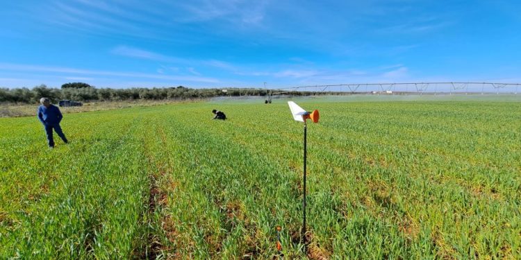 Nos dias 27 de fevereiro e 1 e 3 de março, a equipa do projeto “AlViGen: Criação de polo no ALentejo para a VIgilância GENómica de doenças na agricultura” iniciou o trabalho de trabalho com a instação de armadilhas de esporos, conhecidas como capta-esporos, em campos de trigo. As armadilhas permitem captar esporos e identificar as espécies de fungos que circulam no ar e, em particular, as variantes do fungo Puccinia striiformis, causador da ferrugem amarela no trigo, bem como as suas características de virulência e resistência a fungicidas.