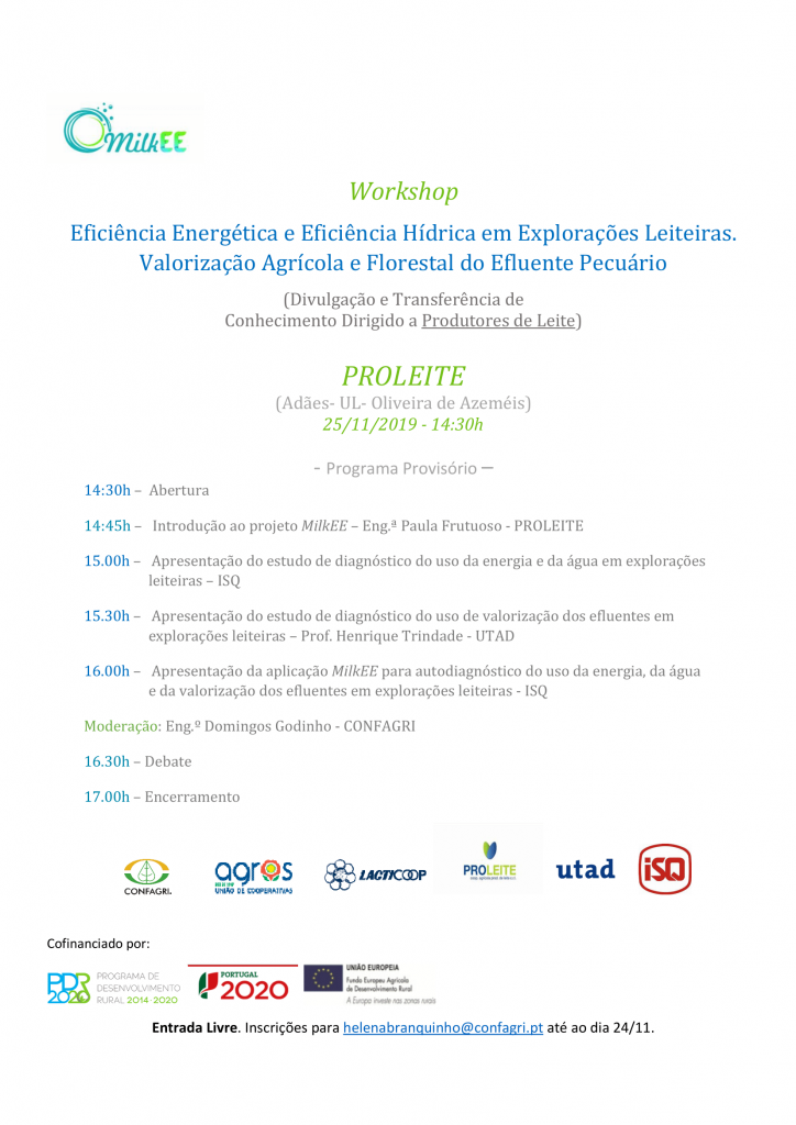O projeto milkEE irá realizar um workshop destinado a produtores de leite no próximo dia 25 de Novembro, pelas 14h30, na PROLEITE (Adães, UL, Oliveira de Azeméis).